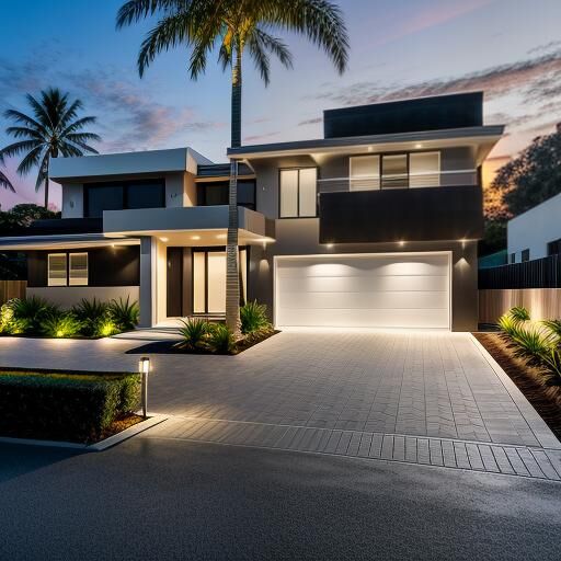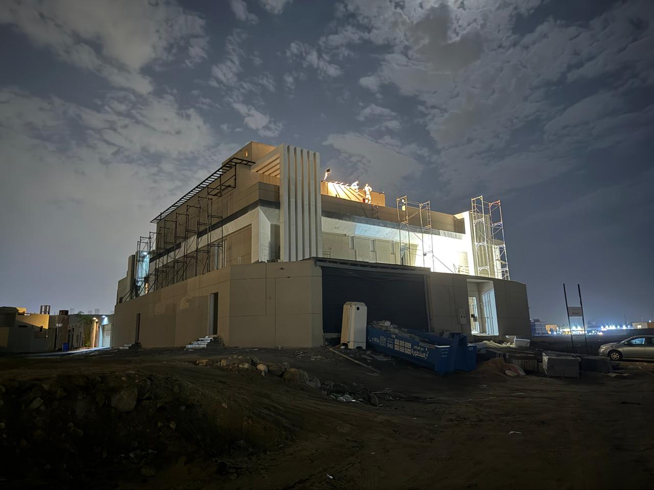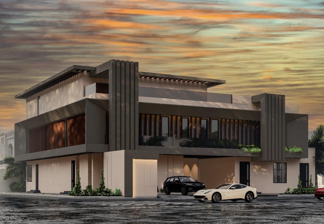Contemporary villa with a modern GRC façade, clean lines, soft LED highlights, and minimal landscaping for a sleek elegant look